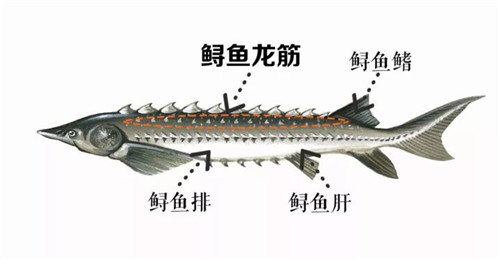 其中,鲟鱼仅有的一根筋骨,也是相当稀有珍贵的。鲟鱼龙筋是一种稀有罕见的海珍品,俗称“脑黄金”。鲟龙筋实为鲟鱼的脊骨骨髓,其洁白如雪,质地柔韧,在清朝就是专供皇帝享用的贡品。
