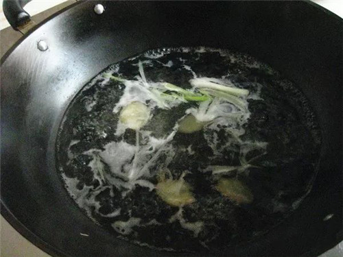 2. 烧一盆水加入三勺料酒和几片姜片;
