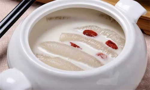 接着用水浸泡一个小时,待龙筋膨胀发起后放冰保管,要吃时再拿出,而发好鲟龙筋可扒、可炖、也可做成甜品。