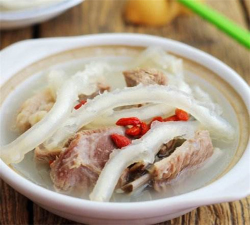 鲟龙鱼筋500g、羊排600g、姜、盐、枸杞、料酒。