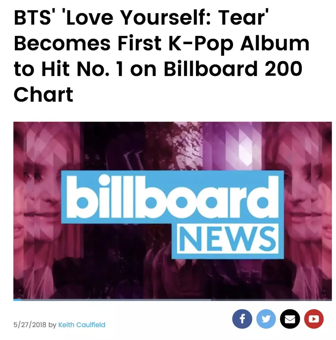 5月27日,美国公告牌排行榜(Billboard)网站宣布,韩国男子团体BTS(防弹少年团)的新专辑《Love Yourself 转 ‘Tear’》首周销量获得了公告牌200专辑榜(Billboard 200)的周冠军。