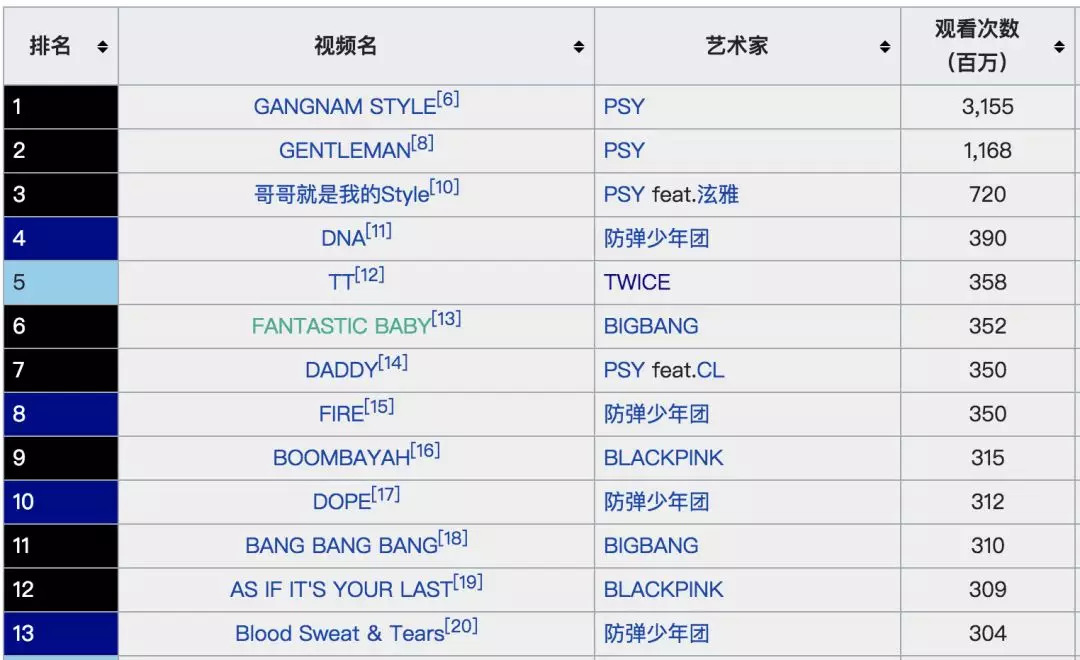 从YouTube的播放量可以看出来,上述艺人的MV几乎垄断了“3亿俱乐部”。