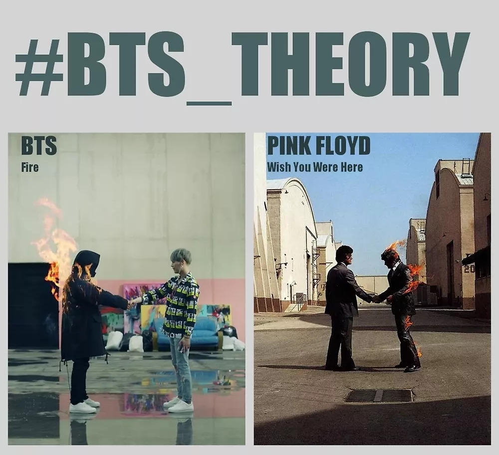 以BTS为例,从表达上看,《Dope》可以说是一个比较有代表性的作品。这首歌的歌词传达出“我不说YES”、“我跟你们不一样”、“我拒绝被否定”等反叛的信息。这种表达,与其说是偶像团体式的,不如说是摇滚乐队式的。类似的例子还有《Fire》,这支歌曲里传达的“青春期反叛”——一无所有、酩酊大醉、街头谩骂、放肆呐喊——在摇滚歌曲里比较常见。实际上,在《Fire》的MV里,SUGA与黑衣人握手起火的一幕,就是致敬传奇摇滚乐队Pink Floyd。