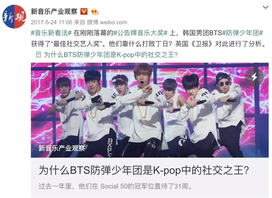 不少媒体是从2017年美国公告牌音乐奖(Billboard Music Awards,以下简称BBMAs)开始关注到BTS的,当时他们获得了BBMAs的“最佳社交艺人”(Top Social Artist)。英国《卫报》对此进行了分析。