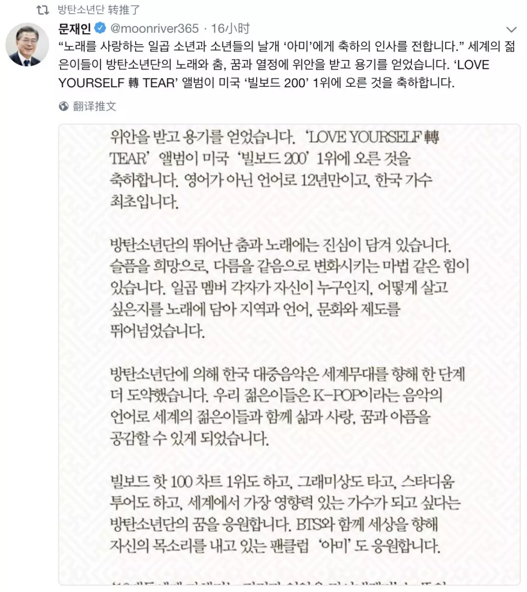 韩国总统文在寅发推祝贺BTS创造历史:“向热爱唱歌的七个少年和少年们的翅膀‘Army’表示祝贺。全世界的青年们通过防弹少年团的歌曲和舞蹈、梦想和热情获得了慰藉和勇气。