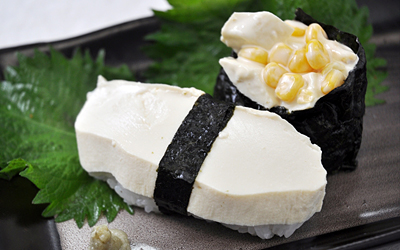 只用一块盐渍豆腐,加上米饭、海苔,一个最简单的豆腐寿司就完工了。或者稍微复杂一点,豆腐切小块,和熟玉米、蛋黄酱拌匀,再做成寿司。这么奇特的寿司很少见,估计只有他们自己才能体会个中的精妙之处吧……