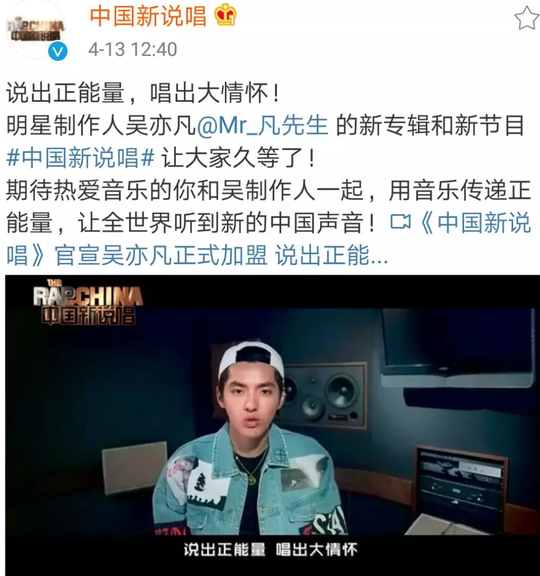 随后,4月13日《中国新说唱》宣布全球海选启动,并发布了一支主题为“说出正能量,唱出大情怀”的宣传片,被不少网友看作是“求生欲”的及时体现。分析人士认为“中国新说唱”的“新”一方面体现在对内容“度”的把控上,这包括艺人过往历史和歌词内容,避免出现导向问题。