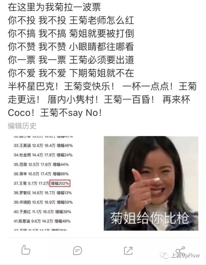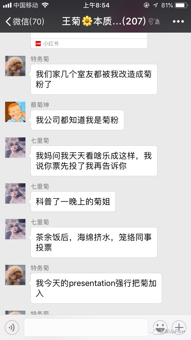 粉丝A:我认识王菊那会儿,她在我们学生圈都是那种美女菊的人设!初中市三女中的!上海顶顶好的女子学校!为了追梦想高中毕业之后一直在一些场所跳舞唱歌,本来长得好看完全可以说做个别的工作都不会这么辛苦!请大家爱护我菊!Pick我菊!为菊打call。