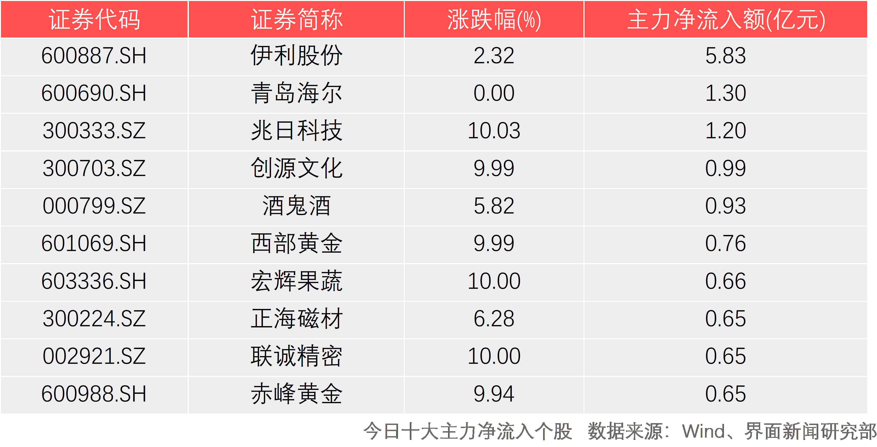 从个股表现上来看,剔除刚开板的新股,今日主力资金净流入排名前三的是伊利股份(600887.SH)、青岛海尔(600690.SH)、兆日科技(300333.SZ),分别净流入5.83亿元、1.30亿元、1.20亿元。今日盘面上酒类股带领消费板块抵抗,农业股也较为抗跌,黄金股逆势大涨。酒鬼酒(000799.SZ)、宏辉果蔬(603336.SH)、西部黄金(601069.SH)、赤峰黄金(600988.SH)在今日均获主力流入。