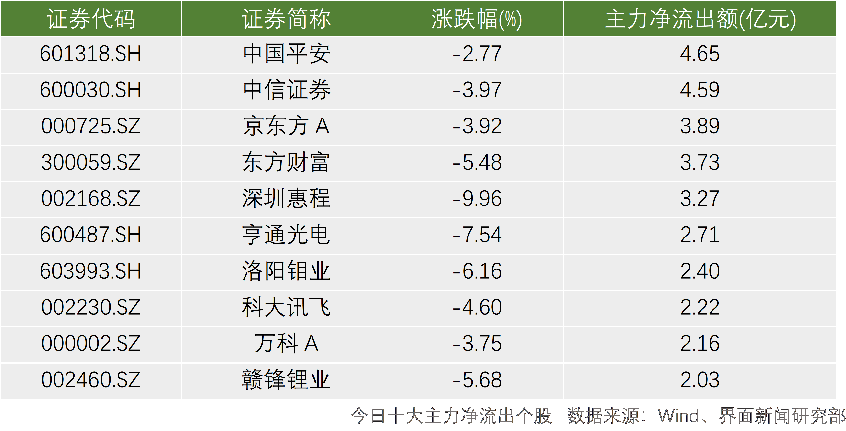 中国平安(601318.SH)、中信证券(600030.SH)、京东方A(000725.SZ)成为主力资金今日重点抛售对象,分别净流出4.63亿元、4.59亿元、3.89亿元。今日盘面上近200股跌停,各大行业龙头股遭主力大额流出。锂电池概念股深圳惠程(002168.SZ)遭主力抛售跌停。