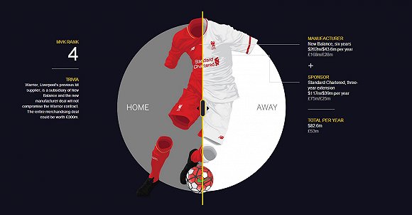 在2015年至2019年的赞助周期中,渣打银行为利物浦提供的赞助费达到每年2500万英镑。这也让利物浦拥有了当时仅次于曼联(雪佛兰,每年5300万英镑)、切尔西(横滨轮胎,每年4000万英镑)、阿森纳(阿联酋航空,每年3000万英镑)的英超第四昂贵的“胸”。