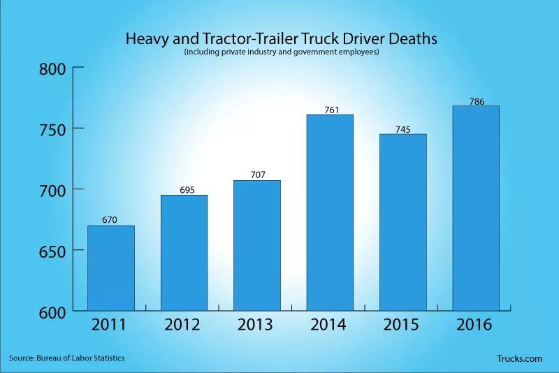 货车司机是全美致死率最高的职业之一,2017年786名货车司机死于事故。自2011年以来,死亡率上升了17.3%。