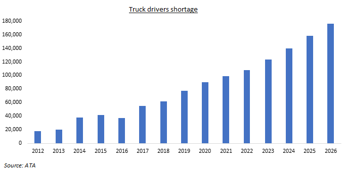 按照目前的情况来看,美国的货车司机短缺会逐年增长,甚至会逼近180,000人