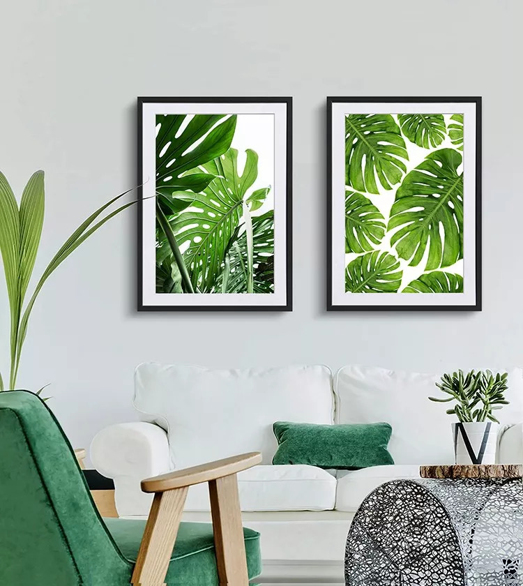 如果你想打造一个小清新的空间,那一定要首选植物系装饰画。植物系装饰画非常适合大白墙,尤其是热带绿植,瞬间就有了ins风。