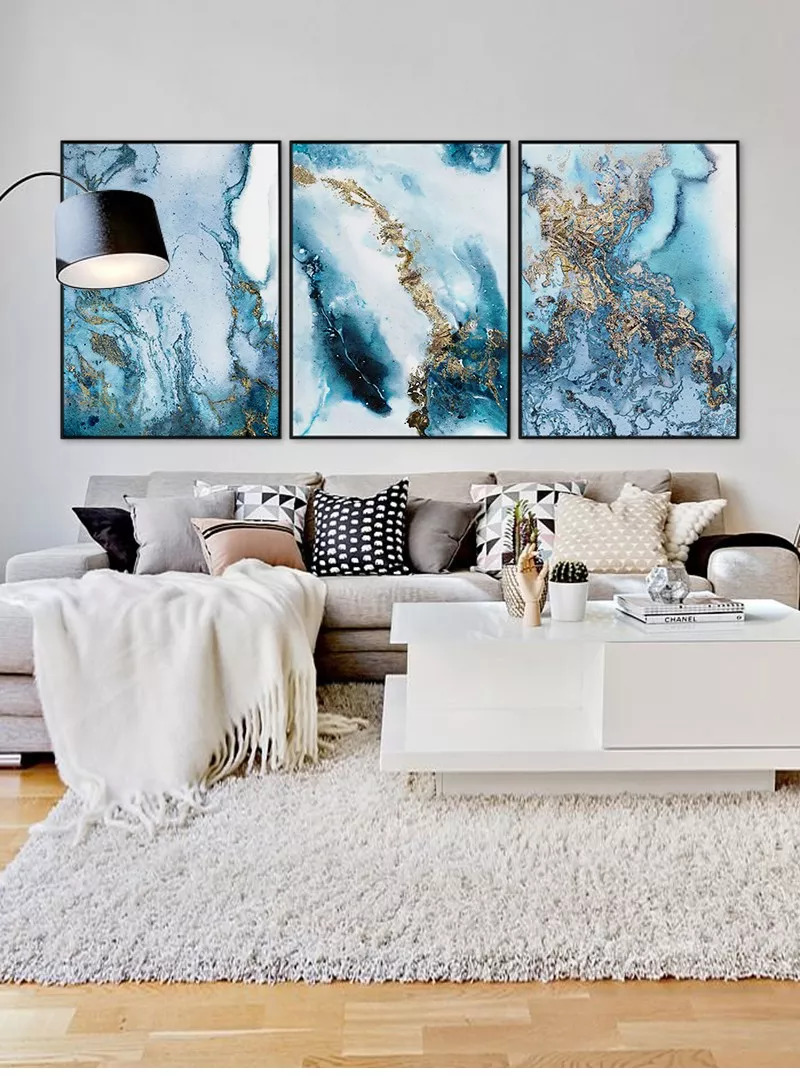 如果想多摆几幅,简洁的植物系挂画也非常好搭配,或者直接买一副切割成三幅的装饰画,既有层次感,又富有新意。