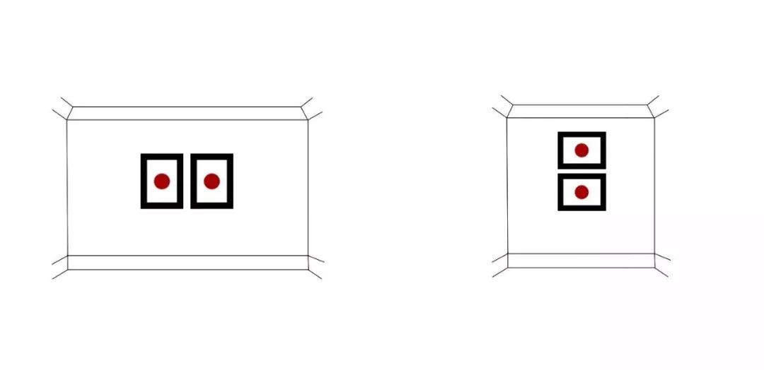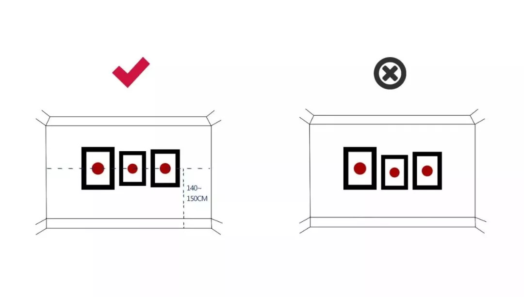 多幅装饰画的挂法关键是让他们的中心点在同一条线上,当然也最好是在视平线上,这样的方式是最不突兀,最具美感的。如果画的内容比较饱满的话,上对齐和下对齐的挂法就会显得生硬。