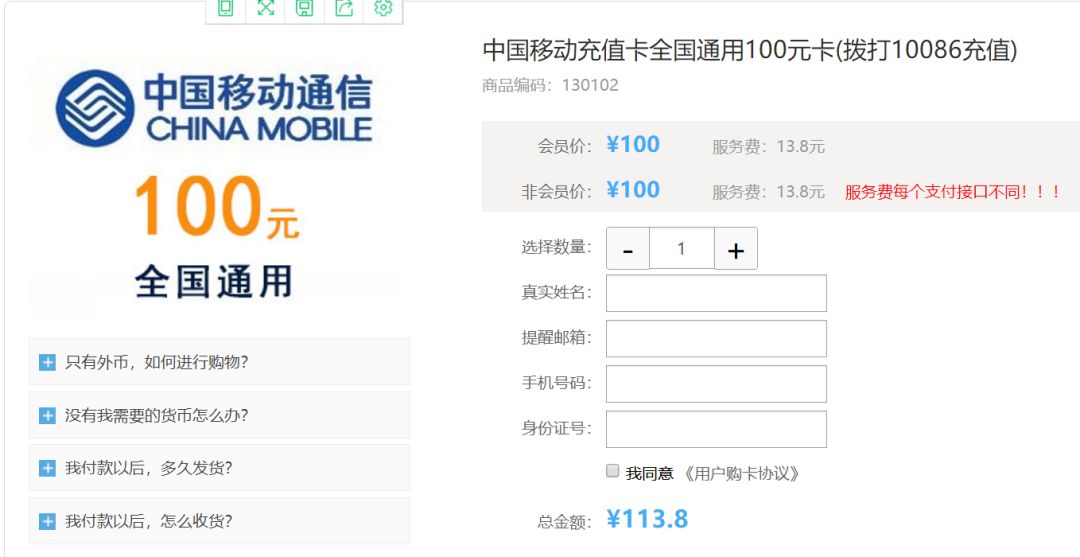 在网上随便搜索一个卡密售卖网站,点开购买界面能让人瞠目结舌,一张100元的移动充值卡,加上服务费最终的售价是113.8元。