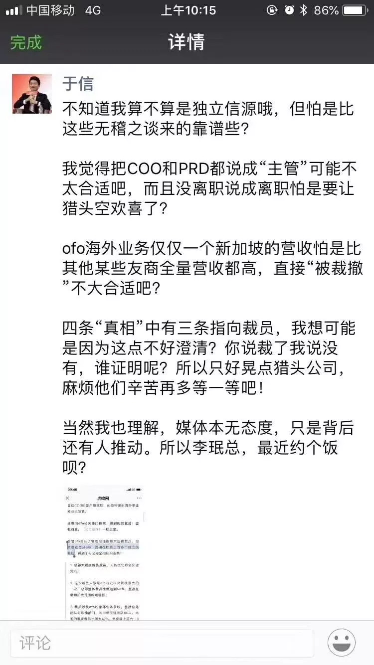 ofo联合创始人于信在朋友圈对此新闻进行了回应,表示相关消息是无稽之谈、背后有人推动。很多公司在面对对公司不利的传言时,要么不回应,要么态度强硬地回应——既然是谣言自然应该追究造谣和传谣者责任,否则就很没底气。而于信态度却很温和,甚至想要跟这家媒体的负责人约饭,从这一点可以猜测,对应的报道或许有出入,但不是凭空想象:ofo正在收缩或者说优化。