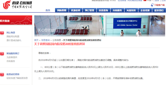 具体标准为:自2018年6月5日起(以出票日期为准),国内航线燃油附加费每航段由人民币0元上调为人民币10元;国际航线依然保持不变。