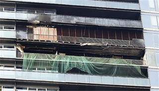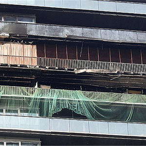 杭州消防支队近江中队 中队长 吴锋:到尊蓝钱江(尊蓝钱江豪华精选酒店)那个通道口的时候,我发现前面是绿化,还有一个铁门锁着。这个时候我们已经看到着火建筑楼层有明火冒出,在翻滚,然后浓烟冒出来,楼上有东西往下掉。这个时候我就命令车上的人员跟我一起下车,带上装备,由班长破拆铁门,然后到达着火建筑底部。