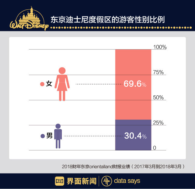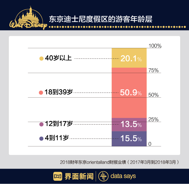 以东京迪士尼为例,根据Oriental World 2018年4月最新的数据,过去一年到访东京迪士尼的游客中,18至39岁的成年人最多,约为整体五成,其次则是4到11岁儿童,占15.5%。18岁以上的大学生、年轻父母等等才是迪士尼的游客主力,其中男女比例约为3:7。