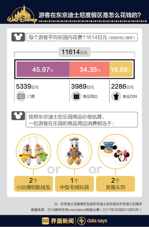 2018财年平均每个游客在东京迪士尼乐园内花费11614日元(约人民币680元):其中门票消费5339日元(约人民币313元),商品周边购买3989日元(约人民币234元),食品饮料2286日元(约人民币134元)。在2014、2015年前后,人们在乐园内的商品周边购买花费一度赶上了人们的门票开销。此外商品销售的毛利率也比门票销售更高,接近60%。
