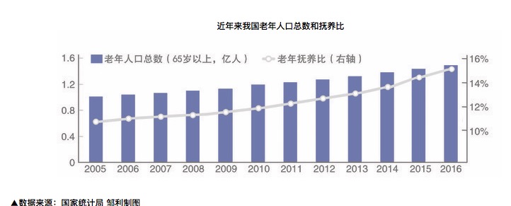 1999年,我国60岁以上人口占到总人口的10%,标志着我国开始进入老龄化社会。仅仅18年,这一数据在2017年末就达到17.3%。