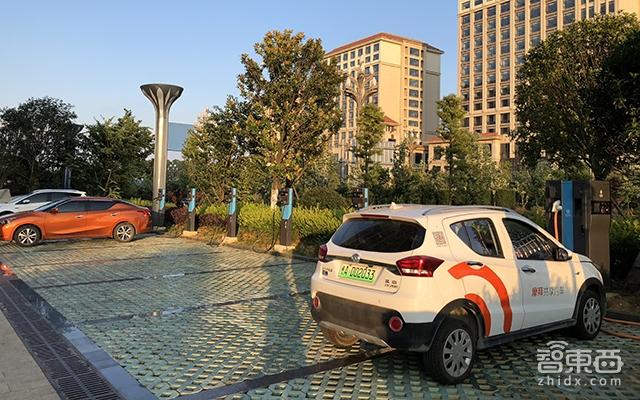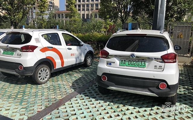 到地一看,这片停车场上的摩拜共享汽车一字排开还真不少,至少有5~6辆可选车,大部分都正在充电中。