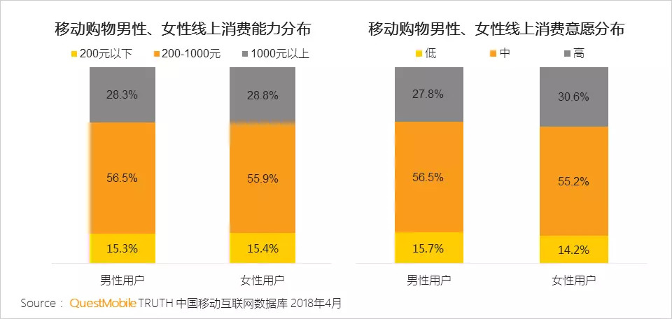 QuestMobile数据显示,移动购物男性线上消费能力并不弱于女性。其中,中上消费能力(高于200元)的男性甚至略高于女性。