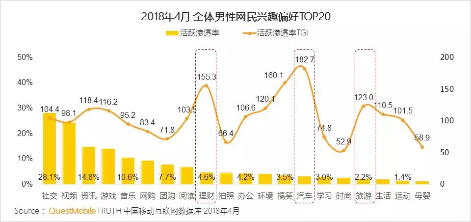 QuestMobile数据显示,男性对于社交,泛娱乐类(视频、音乐、阅读)、游戏、网络购物均表现出很高的兴趣,其中,汽车、理财、旅游等高端消费领域TGI尤其高,这将进一步推动“他经济”升级。