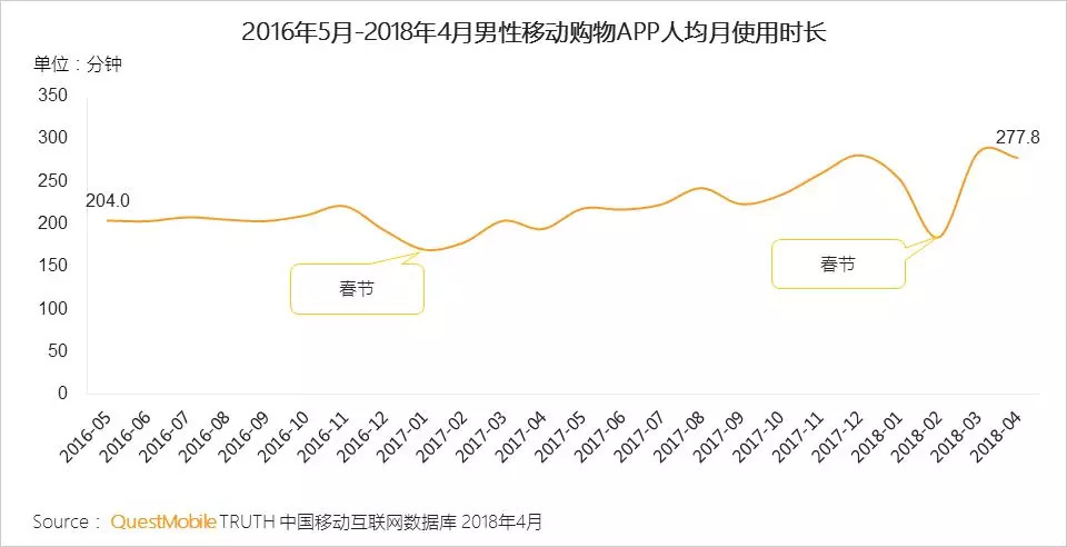 QuestMobile数据显示,男性移动购物APP人均月使用时长呈上升趋势。2018年4月比2016年5月增加36%,男性对于移动购物APP使用粘性不断增强。