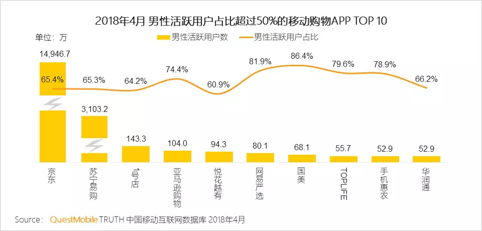 QuestMobile数据显示,男性用户在京东、苏宁易购等电商用户比例超过女性。京东、苏宁易购、网易严选、TOPLIFE等电商凭借对男性用户需求的精准把握,在细分领域的深耕细作,获得了较好发展。