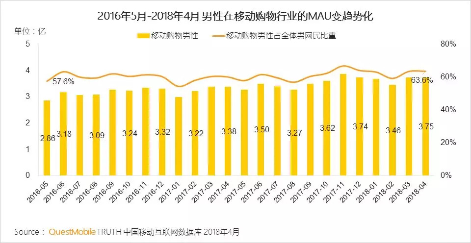 移动购物行业是“他经济”最直接相关行业。QuestMobile数据显示,2016年5月至今,男性移动购物用户稳步增长,月活规模在2018年4月高达3.7亿。同时,有移动购物行为的男性比重也在稳步增加,2016年5月至2018年4月,增加了6个百分点。