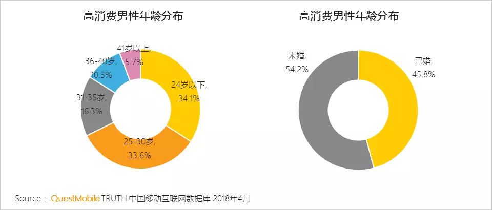 QuestMobile数据显示,高消费男性,即线上消费金额高于1,000元、有移动购物行为偏好的男性月活规模约为8,700万。其中,30岁以下、未婚男性占是主力,是最喜欢买买买的群体。