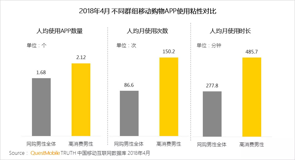 2、高消费男性对移动购物类APP的使用粘性是全网男性的1.7倍