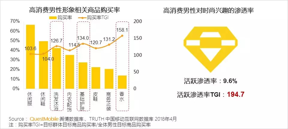 休闲鞋服、个护用品包括香水等与个人形象密切相关的商品购买率高于男性整体。同时,高消费男性对于时尚的兴趣渗透率高于整体。显示出颜值消费已经成为“他经济”重要驱动力量。