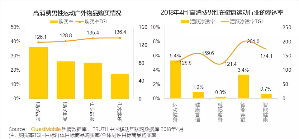 QuestMobile数据显示,高消费男性对于健康运动、户外运动兴趣更突出。表现在对相关物品的购买率更高,在运动健身、智能设备行业的活跃渗透率更高。