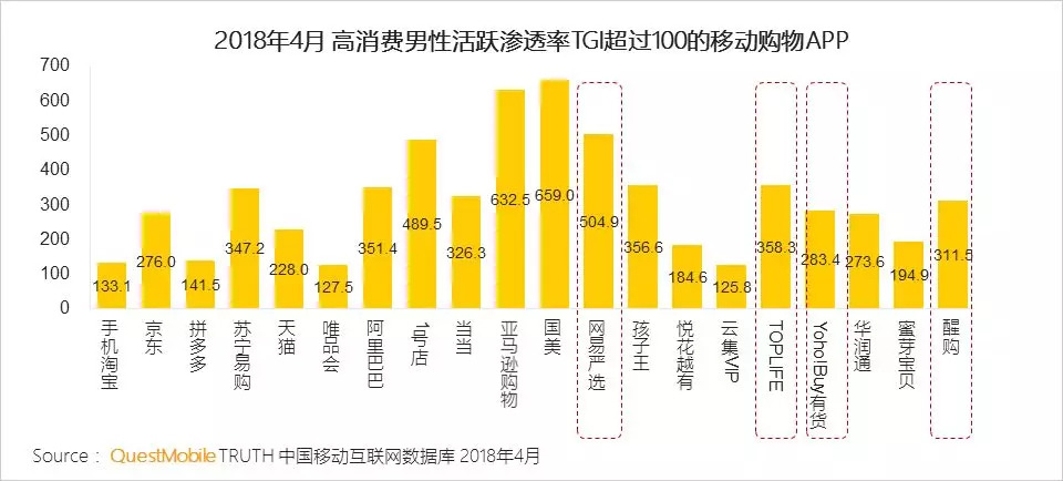 由于对消费品质要求较高,除了在手机淘宝、京东等传统综合电商购物外,高消费男性对于网易严选、TOPLIFE、Yoho!Buy有货等精品电商的渗透率TGI高,个性化需求日益凸显。