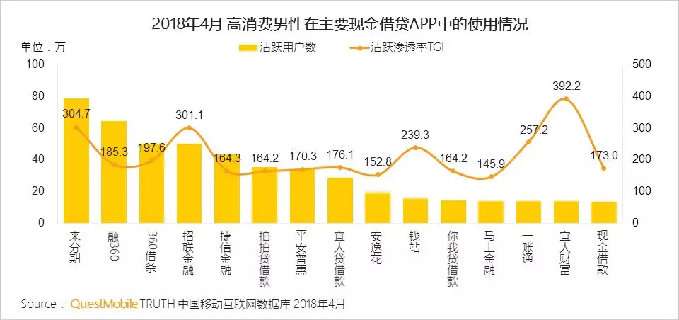 QuestMobile数据显示,高消费男性在现金借贷中活跃渗透率显著高于行业整体,反映出该群体对于超前消费有很高的接受程度。