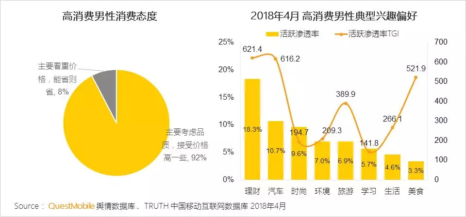 QuestMobile数据显示,超过90%的高消费男性对于商品品质更为重视,愿意为高品质付出更多金钱。他们对于理财、汽车、旅游、美食兴趣非常高,说明高消费男性不但喜欢买买买,对于生活品质要求也非常高。