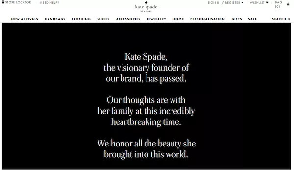 6月5日,美国著名设计师Kate Spade被女管家发现在纽约帕克大道的家中上吊自杀,享年55岁。Kate Spade的卧室门把手上挂了一条红色围巾,还留有一张便笺。一家网站称,便签为其女儿而留,内容为:"Bea...我永远爱你。这不是你的错,问你爸爸!”但是警方并没有透露更多调查细节。