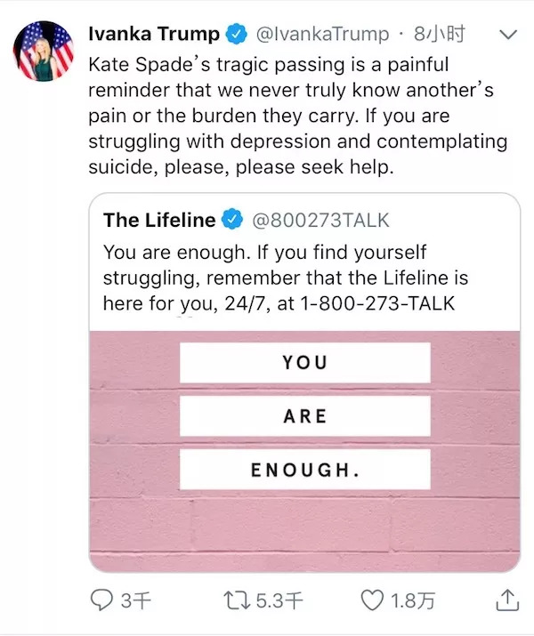 然而,正如twitter上许多追思者写道的那样,“在这世界上,你遇到的每个人都在进行你一无所知的内在抗争。”“设计师Kate Spade留下了市值10亿美元的品牌和2亿净资产,但这让我们警醒,金钱不能买到幸福。做个善良有爱的人吧。”