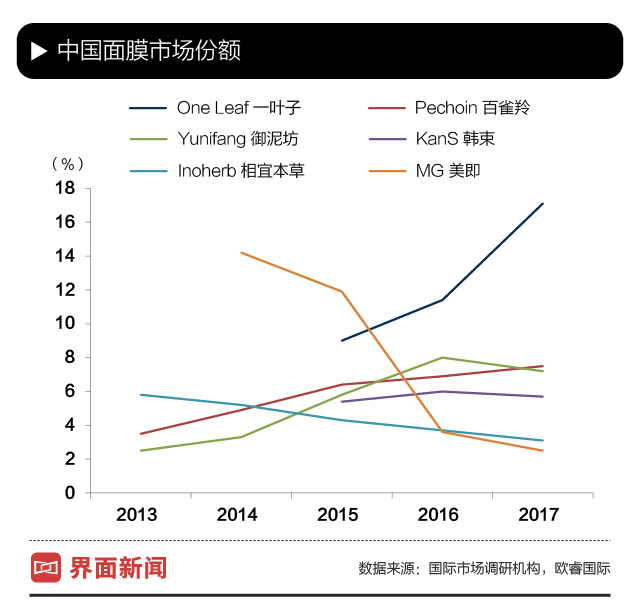 实际上,美即离开面膜老大的位置已经很久了。国际咨询公司欧睿国际的数据表明,2016年,美即市场份额从前一年的11.9%猛跌至3.6%,而该年一叶子市场份额从9%增至11.4%,强势超车,同时百雀羚、御泥坊、韩束等品牌后来居上。2017年,曾经市场份额第一的美即市场排名已跌至第六名之后。