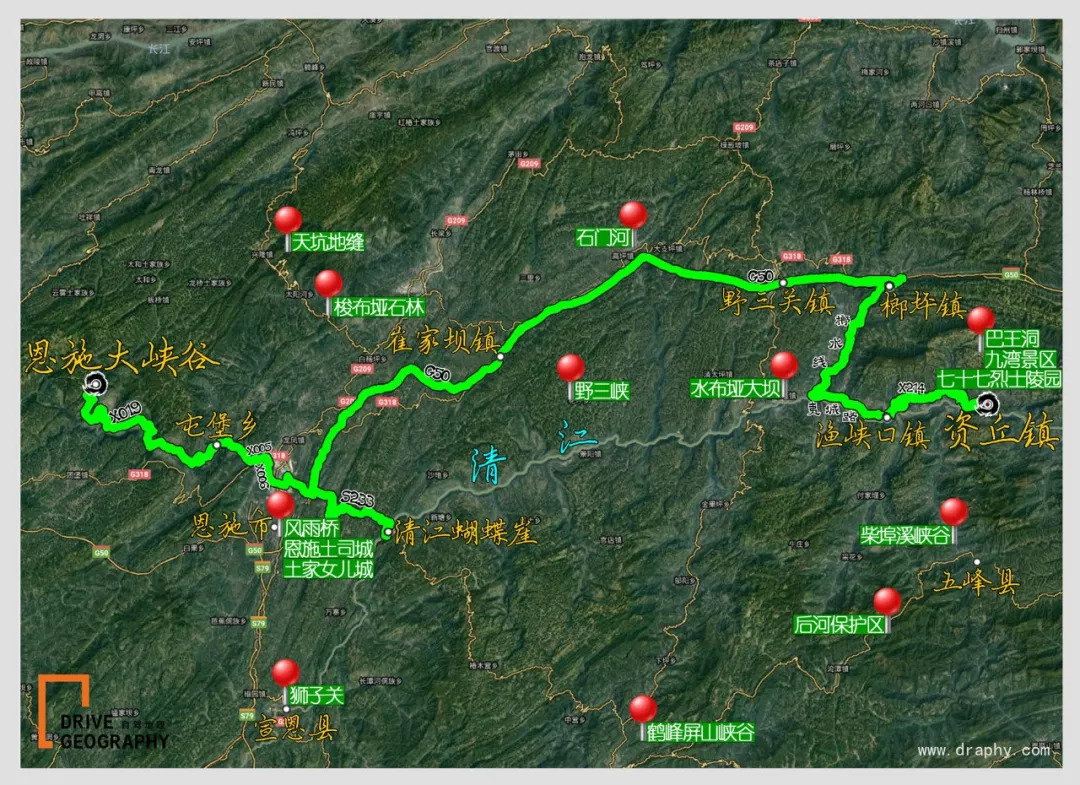 恩施大峡谷50km 屯堡乡 55km清江蝴蝶崖 90km 崔家坝镇 55km 野三关镇 25km 榔坪镇 45km 渔峡口镇 35km 资丘镇