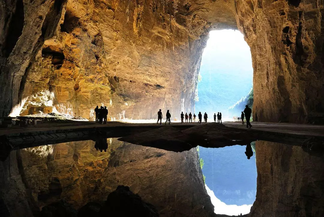 腾龙洞原本是国内最长的洞穴,全场五十多公里,后来输给了一百多公里长的贵州双河洞,《中国国家地理》评选的最美洞穴第四名,可游玩的地方仅有六公里,分前、后洞,前洞规模大,还有土家歌舞和激光秀,最特别的就是“调皮”的清江从洞中潜过~