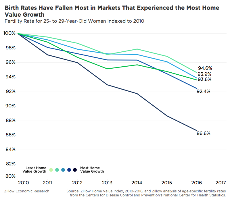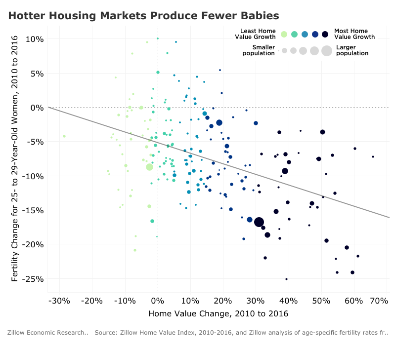 在2010年到2016年期间,美国经济复苏使得房价出现了显著的上涨。与此同时,生育率则有所下滑。这两个趋势间或存在某种联系(这种联系并非没有依据),这种联系在25-29岁的女性身上表现得尤为显著:在美国,房价涨幅最大的地区,生育率的跌幅也最大;在房价涨幅较小的地区,生育率往往跌幅较小,甚至有小幅增长。