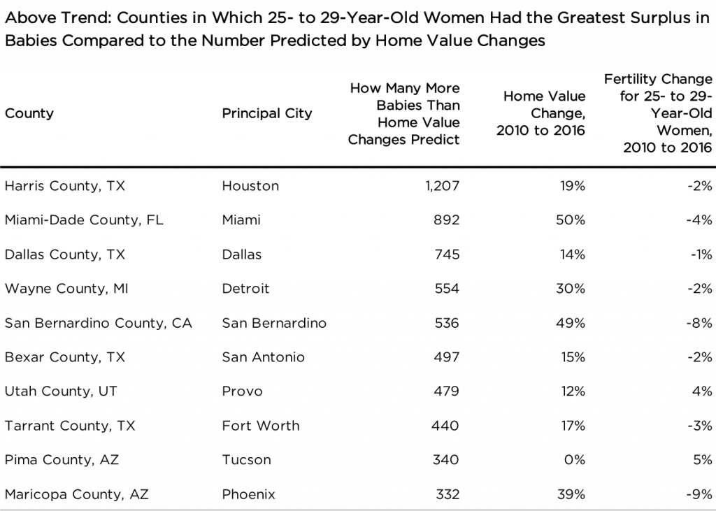 某些地区的生育率变化与总体趋势有较大差距。在南部和西南部地区,生育率的跌幅与模型根据房价涨幅算出的预期值并不一致。得克萨斯州新兴城市和阳光充沛的西南地区虽然也经历了房价的上涨,但却未出现模型预计的人口跌幅: