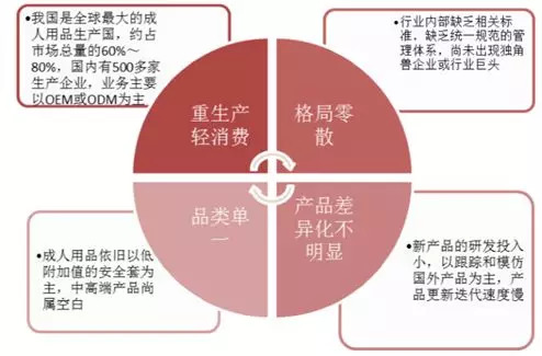1. 首先,重生产轻消费。因为文化保守,中国成人用品市场仍然呈现重生产轻消费的现状,国内成人用品行业至今依旧处于边缘市场。但与之相对的是,我国目前仍是全球最大的成人用品生产国,约占市场总量的60%~80%。强烈的对比说明中国成人用品行业在消费端仍旧拥有巨大空间。