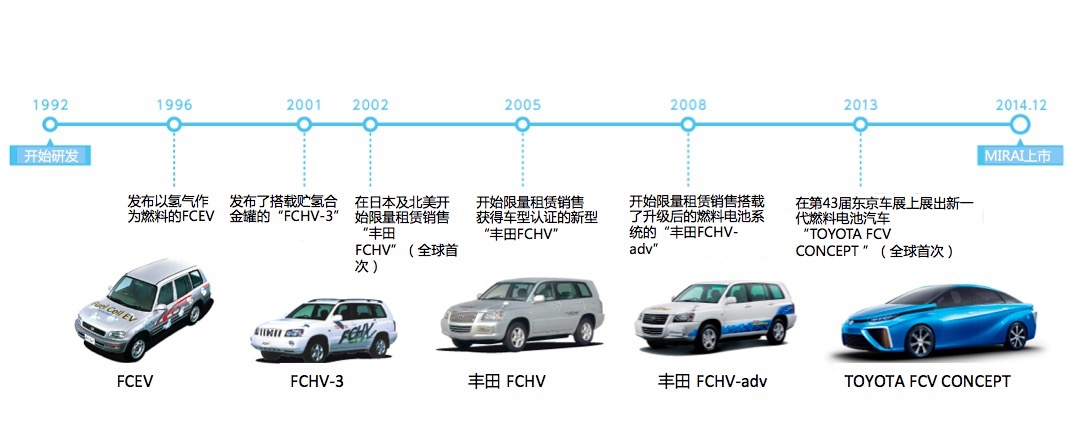 从1992年开始研发,丰田在1996发布了首款FCEV,并在2002年率先在北美市场销售丰田FCHV车型。而2014年12月量产上市的Mirai已是丰田的“第五款”燃料电池车型。