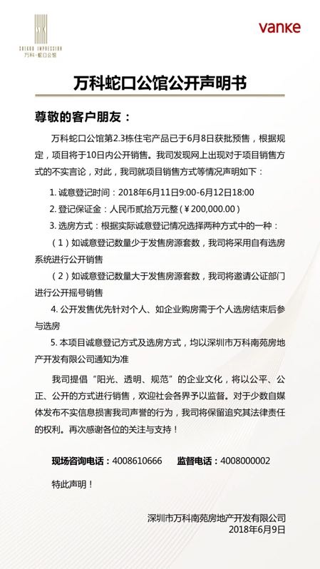 6月9日,万科发布公开声明,该份公开声明进一步明晰了万科蛇口公馆此次开盘的选房方式。具体情况如下:如诚意登记数量少于发售房源套数,其将采用自有选房系统进行公开销售;如诚意登记数量大于发售房源套数,其将邀请公证部门进行公开摇号销售。该份声明还表示,此次万科蛇口公馆公开发售优先针对个人,企业购房需于个人选房结束后参与选房。